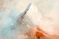 Een glinsterende piek rijst majestueus op in zachte aardetinten, oplichtend in stralend wit. Omgeven door een mist van koele blauwe tinten vermengd met warme, beige-oranje nuances, brengt de foto een gevoel van kalmte en grootsheid over. De zachte overgangen trekken de kijker mee in de mystieke sfeer van dit landschap.