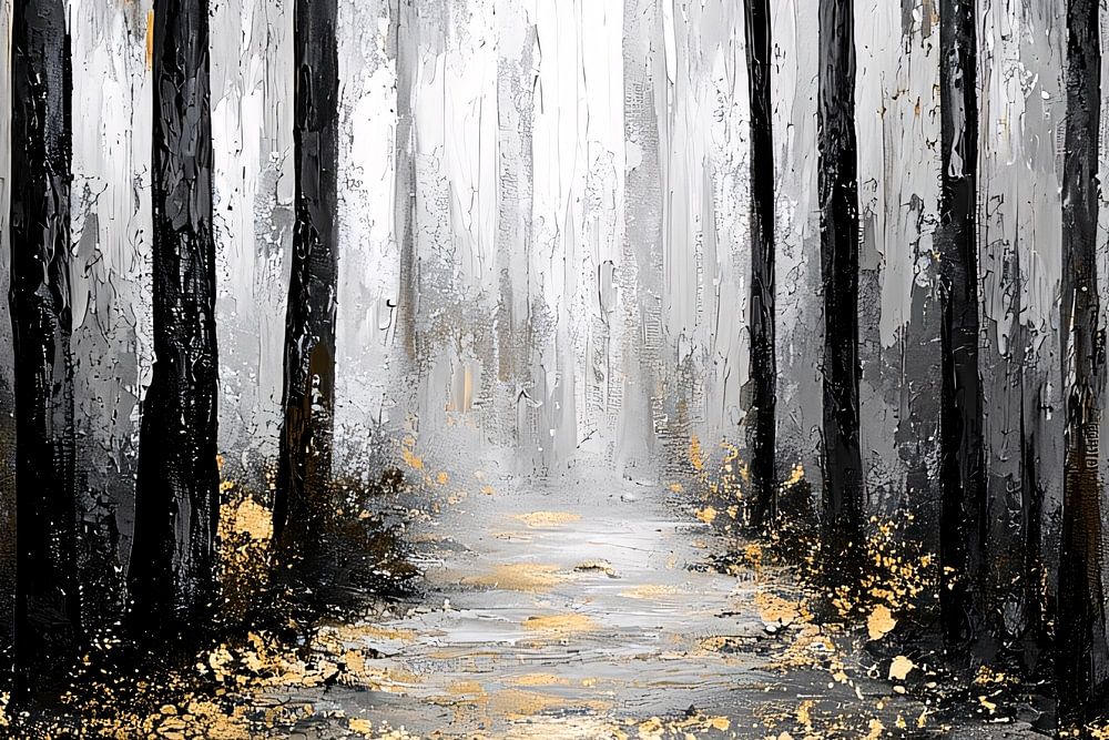 Dit unieke kunstwerk brengt de rust en mysterie van een bos tot leven. De combinatie van abstracte lijnen en subtiele gouden details geeft het schilderij een luxe en moderne uitstraling. Perfect voor een interieur dat een stijlvolle en serene sfeer wil uitstralen. Ideaal voor zowel woonkamers als slaapkamers, dit ontwerp biedt een harmonie van contrasten met zijn zwart-witte kleurenpalet en sprankelende accenten. Laat je meevoeren door de diepte van dit mysterieuze landschap en voeg een uniek, elegant element toe aan je ruimte.