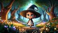 Een jong meisje in heksenkostuum wandelt door een bos dat baadt in een zacht, betoverend licht. Het pad, omzoomd door mystieke bomen, leidt naar de diepte van het bos, waar de lucht is doordrenkt met sprankelende deeltjes. De sfeer is kalm en vredig en het lijkt alsof elke plant en elk deel van de boom bedekt is met fijn, lichtgevend stof. Het meisje, op haar gezicht nieuwsgierig en vol verwachting, is gefascineerd door de schoonheid van haar omgeving en tegelijkertijd opgewonden over wat ze aan het einde van dit pad zal vinden.
