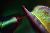 Het spel van licht en schaduw geeft deze macrofoto van rozenblaadjes een mysterieuze uitstraling. Dit wordt nog eens benadrukt door de verschillende tinten groen.