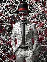 Dit kunstwerk combineert elementen van surrealistische en popart-stijlen, waarbij de contrasten tussen zwart, wit en rood de compositie kracht en diepte geven. De centrale figuur, gehuld in een strak gestreept pak en met een opvallende hoed en zonnebril, straalt een gevoel van mysterie en stijl uit. Het gebruik van de rode accenten in de zonnebril, hoed en achtergrond weeft een visuele samenhang door het hele werk. De achtergrond, met zijn ingewikkelde web van lijnen, roept een gevoel van vervreemding op, alsof de figuur gevangen zit in een abstracte, moderne wereld.