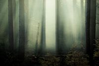 Mysterieus licht op een vroege mistige ochtend op de Veluwe, Nederland.