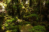 Een mysterieus bos met stenen vol mos, midden in de hoge Rhön, Beieren, Duitsland