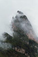 Deze adembenemende foto toont de iconische bergkam van de Seceda, gelegen in de majestueuze Dolomieten van Italië. Omsloten door een laag hangende mist, krijgen de ruige rotsen een mystieke uitstraling. De natuurlijke kleuren, variërend van groenachtige berghellingen tot het warme bruin van de rotsen, creëren een harmonieus contrast tegen de witte waas van de mist. Het beeld nodigt uit tot rust en reflectie en straalt een serene, tijdloze sfeer uit.