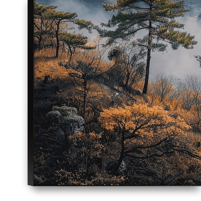 Dit kunstwerk neemt je mee naar een mysterieus berglandschap waar natuur en rust centraal staan. Het toont een reeks imposante bergen gehuld in mist, terwijl de warme herfstkleuren van de bomen op de voorgrond een prachtig contrast vormen met de koele blauwe tinten van de achtergrond. De nevel voegt een vleugje mystiek toe, waardoor het…