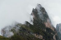 Deze indrukwekkende foto, geschoten op de iconische Seceda-bergkam in de Dolomieten van Italië, toont een dramatisch landschap gehuld in een mysterieuze mist. De scherpe lijnen van de bergen worden verzacht door de witte wolken die langzaam over de groene heuvels trekken. De subtiele kleuren van de rotsen en het gras zorgen voor een natuurlijke balans tussen kracht en rust.