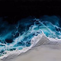 Dynamisch en krachtig tafereel dat doet denken aan het onstuimige gedrag van de oceaan. De diepblauwe en turkooizen tinten suggereren de rijke diepten van de zee, terwijl de witte schuimkoppen en golvende structuren de onvoorspelbare beweging van het water nabootsen. Het contrast tussen het donkere bovenste gedeelte en het lichtere…