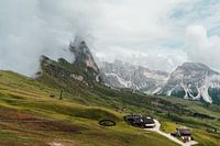 Stap in een wereld van serene schoonheid met deze adembenemende afbeelding van de Seceda-bergkam in de Dolomieten, Italië. Mistige wolken dansen om de dramatische pieken, terwijl de groene grasvelden zich vredig uitstrekken over het landschap. De delicate combinatie van zachte aardetinten en indrukwekkende rotsformaties creëert een intrigerende balans tussen kracht en rust.