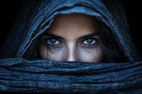 Deze boeiende afbeelding toont een vrouw, slechts zichtbaar door de opening van haar stofomhulde gelaat, die ons aanstaart met een intensiteit die bijna voelbaar is. De subtiele nuances van blauw en zwart vermengen zich met het weinige licht dat haar kenmerken onthult, waardoor een gevoel van mysterie en nieuwsgierigheid wordt gecreëerd. Dit werk spreekt tot de ziel, nodigt de kijker uit om dieper te kijken en te ontdekken wat er achter deze intrigerende ogen schuilt. Ideaal voor een modern interieur, brengt deze afbeelding een artistieke flair die zowel tijdloos als uitdagend is.