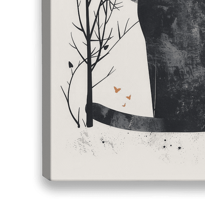 Deze minimalistische illustratie toont een zwarte kat die kalm en mysterieus zit, geflankeerd door kale bomen onder een grote, oranje herfstmaan. De eenvoudige, gedurfde lijnen en het beperkte kleurgebruik versterken de symboliek van de kat als een bewaker van het onbekende. De oranje ogen van de kat weerspiegelen de maan en versterken…