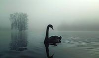 "Dit kunstwerk toont een serene en betoverende scène van een zwarte zwaan die gracieus over een stil, mistig meer glijdt. De zwaan bevindt zich prominent in de voorgrond, waarbij zijn donkere silhouet sterk contrasteert met de zachte, grijze nevel die de hele scène omhult.