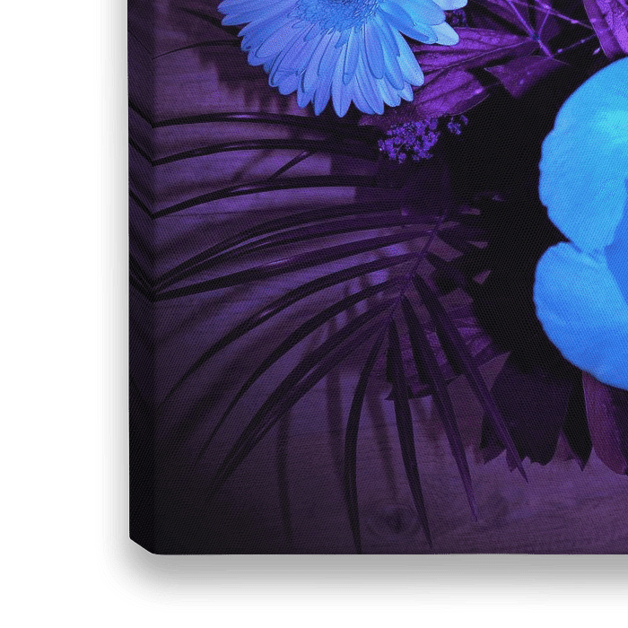Digitaal bewerkte foto van een klaproos en gerbera's. Het is mysterieus en sprookjesachtig in blauw, witte en paarse kleuren. Het is alsof je in een bos loopt met hele grote planten en bloemen die zijn verlicht.
