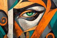 Hier ontvouwt zich een fascinerend spel van kleuren en vormen, met een doordringend groen oog dat de aandacht trekt. De levendige oranje en turquoise tinten roepen een dynamische energie op, ideaal voor een woonkamer waar creatieve gedachten en gesprekken kunnen stromen. Een krachtig statement voor elke kamer!