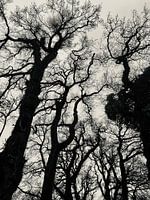 Mysterieus beeld van bomen in het winterseizoen. Zwart-wit fotografie