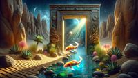 Dit schilderij verbeeldt een oase van mystiek, ingebed in een uitgestrekt woestijnlandschap. Een oud, sierlijk portaal opent naar een verborgen watermassa, een lichtgevende poort naar een andere wereld. Twee koi benaderen het licht dat door het portaal naar binnen stroomt, hun kleuren gloeien op in contrast met de zachte tinten van de omringende stenen en vegetatie. De scène is een concert van kleuren en vormen die het oog boeien en de verbeelding prikkelen. Het is een beeld dat uitnodigt om na te denken over de geheimen die schuilgaan achter de zichtbare werelden en over de paden die ons leiden naar de verborgen schoonheden van het leven.