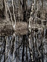 Artistieke impressie van geheimzinnige bomen met weerspiegeling in water, dansend, dynamisch