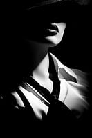 Haar aanwezigheid is voelbaar, maar haar verhaal blijft verborgen in de duisternis. Is ze een femme fatale uit een film noir, een tijdloze muze, of een schaduw die slechts voor een moment zichtbaar werd? Eén ding is zeker: haar beeld blijft in de geest hangen, als een echo van elegantie en mysterie.