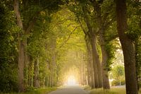 Deze foto is gemaakt aan de Beilerstraat bij Westerbork. Het was erg vroeg en wat mistig. De zon komt er door en verlicht de straat verderop prachtig, waardoor je het effect van een tunnel krijgt. De bomen hebben blad en zijn prachtig groen gekleurd. Door het laagje mist geeft het een mystiek beeld. Sfeervol voor elk interieur. Ook als behang zou deze niet misstaan denk ik.