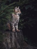 Een jonge wilde kat zit op een boomstronk en staart aandachtig het bos in.