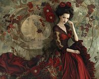 Mysterious Beauty of Patterns - Dit vrouwen schilderij toont een elegante vrouw in een rijkelijk versierde rode jurk tegen een complexe achtergrond van florale en cirkelvormige patronen met een ingetogen portret.