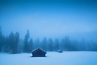 Wooden huts in foggy alpine forest during snow winter sunrise. Bavaria, Germany