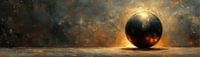 Mystiek Lichtobject - Dit abstracte schilderij toont een groot, donker, glanzend ei-achtig object in het midden, omgeven door een levendige gloed van oranje en gouden lichtstralen, gecontrasteerd tegen een achtergrond met diepe koele blauwachtige en grijze tinten die textuur en diepte suggereren.