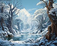 Mystiek Winterlandschap | Winter Natuurkunst - We kijken naar een winterlandschap dat een verkoelende, bijna mystieke sfeer ademt. Het tafereel toont een uitgestrekte natuur met sneeuwbedekte bomen en een rustig, spiegelglad meer dat een serene stilte lijkt uit te stralen. Er is een gevoel van diepte door de gelaagdheid van de voorgrond tot aan de mistige achtergrond met subtiele bergsilhouetten. Het kleurenpalet is overwegend koel met verschillende schakeringen van blauw en wit, met hier en daar een accent van het donkere bruin van de boomstammen. De sneeuw op de takken en grond geven levendigheid door de zachte textuur en de indruk van vers gevallen sneeuw.