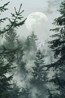 Deze fascinerende foto toont een dicht bos gehuld in mysterieuze mist. Op de achtergrond staat een majestueuze volle maan, waarvan het koele licht het landschap in een mystieke gloed hult. De hoge, donkere bomen lijken de bewakers van een vergeten wereld waar de kijker alleen maar naar kan raden. De combinatie van mist, maanlicht en dichte vegetatie creëert een sfeer van rust en mysterie, die doet denken aan de ongerepte schoonheid en mysterieuze kracht van de natuur.
