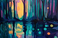 In een mysterieus bos, waar de bomen zachtjes dansen in het zachte licht, smelten kleuren samen tot een fascinerend samenspel. Het glinsterende water weerspiegelt een surrealistische zonsopgang, terwijl lichtgevende stippen een dromerige sfeer creëren. Dit kunstwerk brengt frisheid en inspiratie en is ideaal voor een moderne woonkamer of een creatief kantoor.