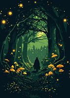 Een somber bos opent zich in een mysterieus pad met gloeiende paddenstoelen. In het midden van de afbeelding stapt een gemaskerde figuur de diepte van het bos in, terwijl zacht maanlicht de scène verlicht. Gloeiende lichtbollen zweven in de lucht en versterken de sprookjesachtige sfeer. De combinatie van donkergroen, warme geeltinten en…