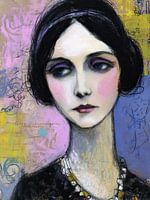 Mystiek en Moderniteit - Op dit portret schilderij zie je een vrouw met een opvallende donkere haarkleur en een heldere uitstraling, die samengaat met de zachte pastelkleuren van de achtergrond, waardoor het geheel een moderne en eigentijdse indruk maakt.
