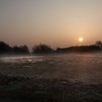 Een vennetje, uitgegraven op een plek waar vroeger een arm van de Kromme Rijn lag, op een mistige ochtend in maart. De zon schijnt als een ster vlak boven de horizon boven de nog donkere plek in het bos. De foto is gemaakt aan de rand van bos Nieuw Wulven op de rand van winter en voorjaar. Nieuw Wulven ligt in de gemeente Houten en Bunnik: nieuwe natuur, aangelegd door Staatsbosbeheer.
