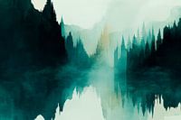 Een mysterieuze mist omhult majestueuze bergen en wordt weerspiegeld in een stilstaand waterlichaam. De zachte groene tinten nodigen uit tot rust en reflectie. Dit kunstwerk doet het vooral goed in de slaapkamer, waar het een rustgevende en harmonieuze sfeer creëert.