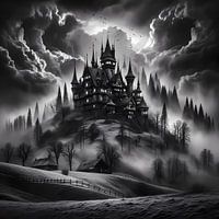 Mystiek zwart-wit kasteel op de heuvel - kunstwerk in monochrome stijl van ButterflyPix