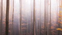 Een bospanorama in de mist is mysterieus en tegelijkertijd schilderachtig. Een sprookjesbos uit een andere wereld.