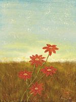 Dit digitale olieverf schilderij toont een paar rode bloemen op stengels tegen een achtergrond van goudachtig gras en een prachtige zonsondergang. De tinten van de ondergaande zon vullen de lucht en creëren een mystieke sfeer. De rode bloemen en het gras worden tot leven gebracht, waarbij de contrasten tussen de levendige bloemen en de serene achtergrond een rustgevende en betoverende sfeer scheppen.