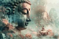 Sta oog in oog met de serene pracht van het mystieke Oosten. Dit adembenemende ontwerp toont een imposant Boeddhabeeld, rustig uitkijkend over een nevelig berglandschap, waar de natuur zich kleurt in de warme tinten van de herfst. Zwevende bladeren dansen rondom de stilte van steen, terwijl in de verte de kleinschaligheid van een ander Boeddhabeeld ons herinnert aan de eeuwigheid van de natuur en de vergankelijkheid van het moment. Perfect voor een hedendaags interieur dat smacht naar een vleugje oosterse mystiek en een herinnering aan de stilte in onszelf.