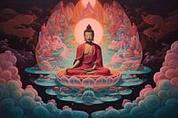 Mystieke Boeddha - Het schilderij toont een vredige Boeddha in meditatie op een lotusbloem, omgeven door mystieke wolken en een cirkel van figuren in een harmonieuze compositie. De stijl combineert traditionele elementen met een moderne, haast grafische afwerking. Gebruik van warme roze en rode kleuren tegen een koel blauw en…