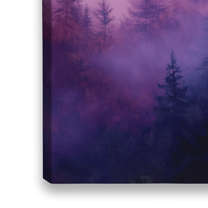 In dit betoverende landschap heerst een serene stilte, waar de ochtendmist als een delicate sluier over de aarde ligt. Hoge dennebomen reiken naar de lucht, hun silhouetten worden omhuld door een magie van blauw, paars, en de vurige tinten van roze en oranjegeel. De lucht, een schilderachtig palet, verandert geleidelijk van diep roze…