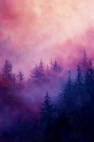 In dit betoverende landschap heerst een serene stilte, waar de ochtendmist als een delicate sluier over de aarde ligt. Hoge dennebomen reiken naar de lucht, hun silhouetten worden omhuld door een magie van blauw, paars, en de vurige tinten van roze en oranjegeel. De lucht, een schilderachtig palet, verandert geleidelijk van diep roze…