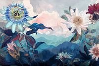 Een betoverend digitaal kunstwerk waarin majestueuze passiebloemen in levendige blauwtinten en zachte pastels zich verheffen boven een mistig berglandschap. De dramatische compositie combineert botanische precisie met een dromerige sfeer, waarbij de bloemen als hemelse wachters over de bergen lijken te zweven tegen een romantische achtergrond van roze en turquoise wolken.