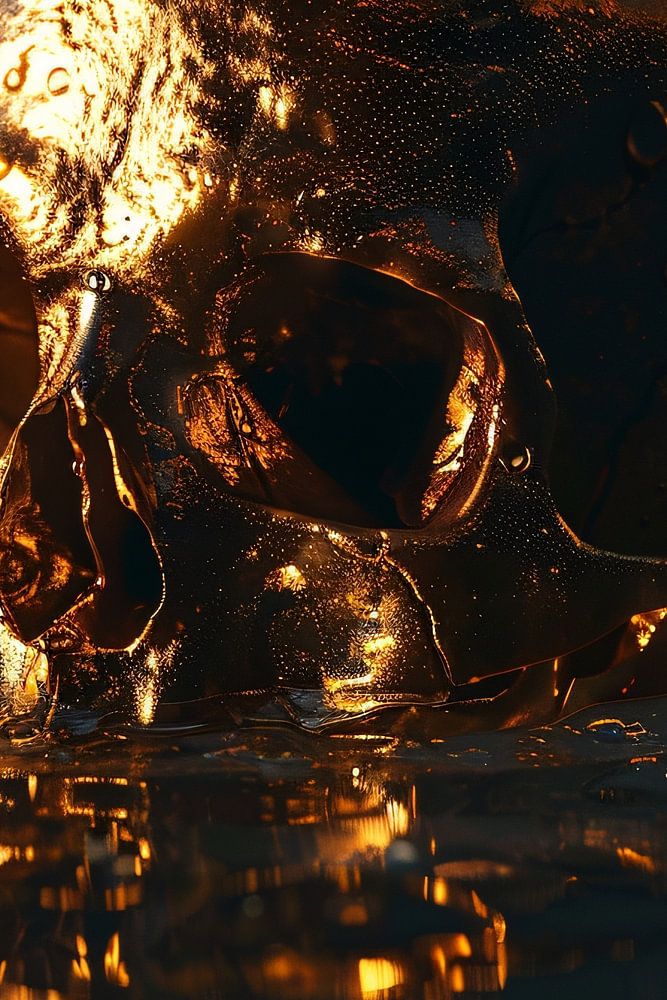 Dit intrigerende kunstwerk toont een glinsterende gouden schedel die rust in kalme wateren, waarbij het gouden oppervlak een prachtig contrast vormt met de donkere wateren. De reflecties in het water versterken de mystieke sfeer, terwijl de schedel zelf een gevoel van vergankelijkheid en de esthetische schoonheid van de dood uitstraalt. Het samenspel van licht en schaduw, samen met de subtiele kleurnuances, maakt dit stuk een unieke aanvulling voor elke moderne kunstcollectie.