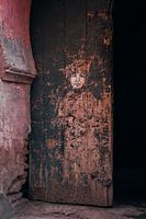 Deze unieke afbeelding toont een verweerde houten deur in de straten van Marrakech, bedekt met een delicate schildering van een persoon. De verweerde textuur van de deur, gecombineerd met de aardse tinten van de muur en het subtiele lichtspel, straalt een mystieke en historische sfeer uit.