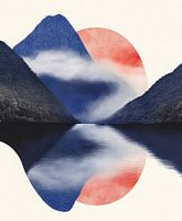 Een betoverend landschap waar majestueuze bergen elkaar ontmoeten in een calmere wateroppervlak, geflankeerd door een cirkel in warme tinten die een gevoel van sereniteit en harmonie oproept.