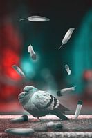 De steenduif, een symbool van rust en sereniteit, vormt een opvallend contrast met de levendige energie van de nachtelijke stad. De zwevende veren voegen een dynamisch element toe, wat een gevoel van beweging en magie in het beeld brengt. Het licht dat door de duisternis dringt, werpt een zachte gloed op de omgeving, waardoor een uitnodigende en fascinerende sfeer ontstaat die de essentie van het stadsnachtleven vangt.