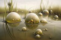 Dit betoverende kunstwerk bestaat uit zwevende, bubbelachtige bollen die sierlijk oprijzen uit een kalm wateroppervlak, omringd door delicate grasachtige elementen. De zachte, sfeervolle verlichting werpt zachte reflecties over het tafereel, wat de dromerige kwaliteit ervan versterkt. Subtiele kleurovergangen en zorgvuldig gelaagde details creëren een gevoel van rust en diepte, waardoor dit werk perfect past in ruimtes die op zoek zijn naar rust, fantasie en een vleugje surrealisme.