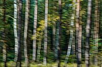De bomen in dit herfstbos lijken te dansen op de wind, wat een mystiek beeld oplevert