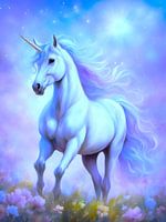 De eenhoorn is afgebeeld in stralend wit en glinsterend blauw, met een spiraalvormige gouden hoorn die op magische wijze het licht vangt. Zijn vloeiende manen en staart glinsteren in lavendel, aqua en paarlemoer, als sterrenstof in de wind. Hij wordt omringd door delicate pastelkleurige bloemen die bloeien in weelderig gras, wat het landschap een kalme, speelse energie geeft. De lucht erboven verschuift van zacht lavendel naar diep indigo, bezaaid met een paar stralende sterren en een heldere gloed die de etherische aanwezigheid van de eenhoorn benadrukt. De compositie roept thema's op van fantasie, puurheid en zachte mystiek en is ideaal voor liefhebbers van mythische wezens en magische werelden. Of het nu voor een kinderkamer, studio of woonkamer is, dit digitale kunstwerk voegt een elegante en rustgevende sfeer toe aan elke ruimte. Het levendige kleurenpalet benadrukt de elegantie van de eenhoorn en creëert een meeslepend fantasiegevoel.