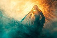 Een mystiek wezen glinstert door een mist van zachte, warme kleuren. Het licht danst om haar silhouet en geeft het moment een etherische uitstraling. Haar lange haren wapperen in de wind terwijl ze in de rust van het moment blijft hangen. Dit indrukwekkende kunstwerk past perfect in de slaapkamer en creëert een dromerige sfeer.