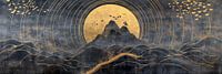 Dit bijzondere kunstwerk toont een bergachtig landschap dat wordt gehuld in een mystieke sfeer van wolken en nevels. De bergen, omlijnd met verfijnde gouden accenten, worden door een cirkel benadrukt, alsof ze worden omarmd door een symbolische aureool. Een eenzame reiziger staat op de top, omgeven door een zwerm vogels, wat een gevoel van vrijheid en introspectie uitstraalt. De combinatie van gedetailleerde inktlijnen en het warme goud zorgt voor een opvallend contrast, perfect voor liefhebbers van serene en symbolische kunstwerken. Dit kunstwerk voegt een gevoel van diepgang en tijdloosheid toe aan elke ruimte en inspireert tot reflectie en bewondering van de natuurlijke wereld.
